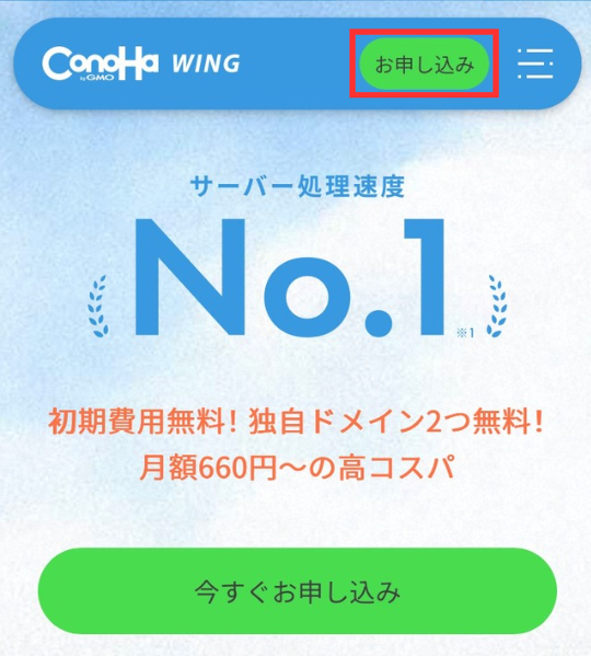 【スマホ版】ConoHa WINGの公式サイトの「お申し込み」をタップ