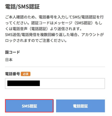 本人確認のため、「SMS認証」または「電話認証」をします。