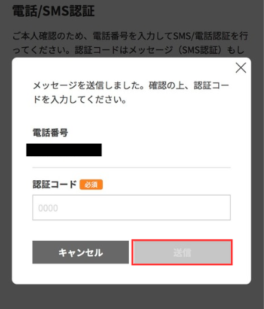 スマホのSMSに届いた認証コードを入力し「送信」をタップします。