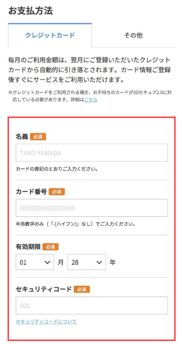 料金の支払いに関する必要事項を入力する画面に移ります。