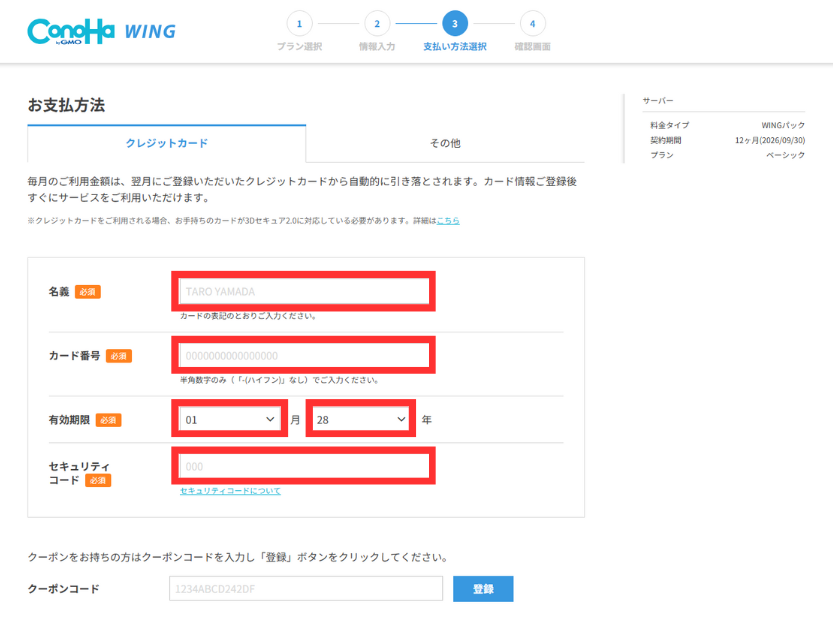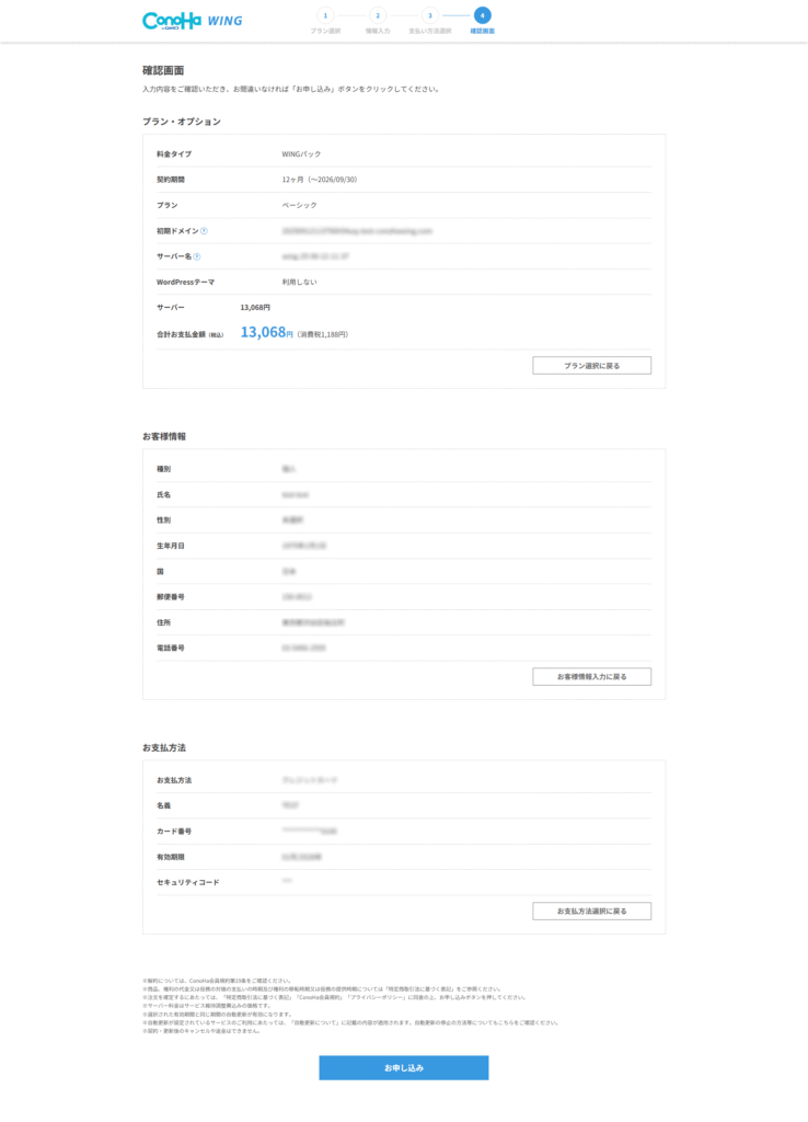 のカード情報を入力し「お申し込み」をクリックしたら、WordPress開設完了です!