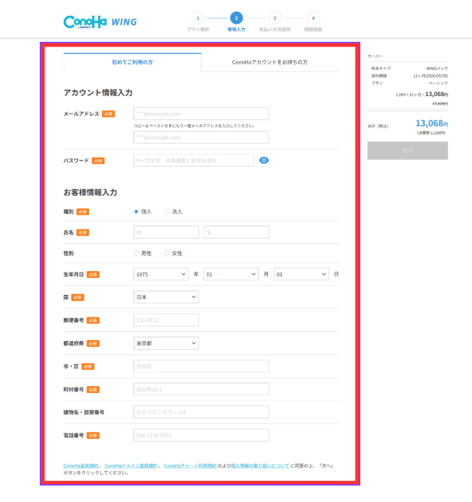 以下画面にて、アカウント開設・契約に必要な個人情報を入力してください。