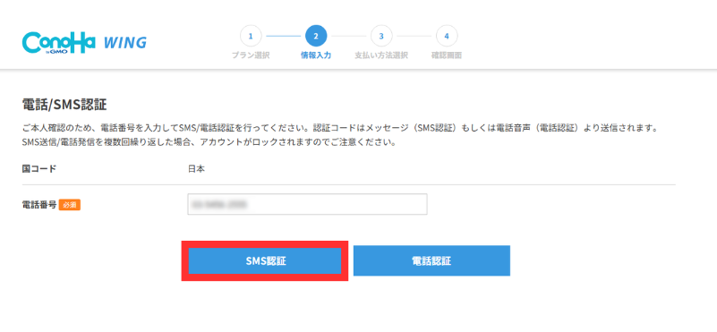 電話番号を入力し「SMS認証」または「電話認証」を選択します。