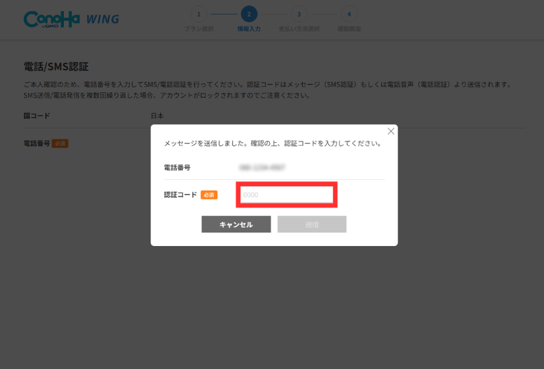 「SMS認証」をクリックしたらショートメールに届く認証コードを入力⇨送信しましょう。