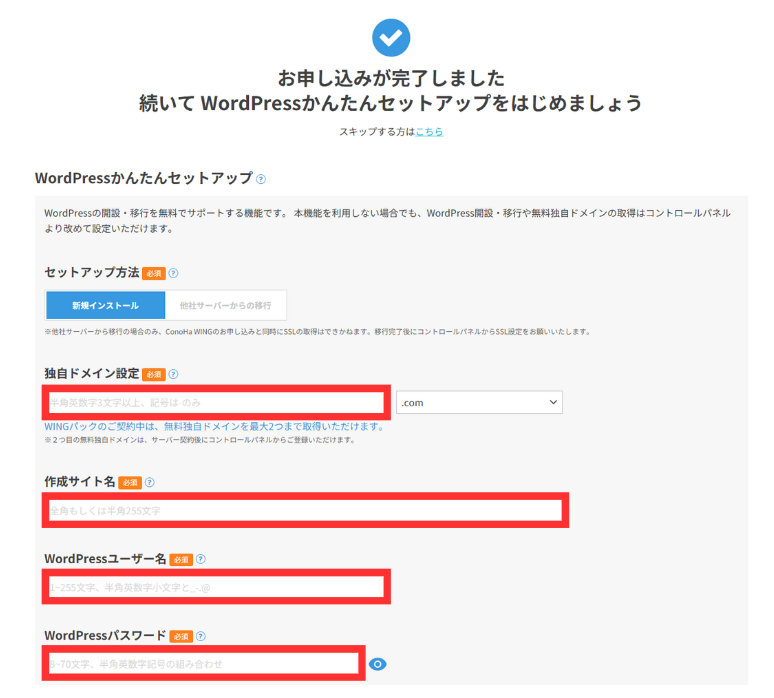 ※WordPressかんたんセットアップ下の「セットアップ方法」は初期設定のまま(「新規インストール」が青色状態)でOK!