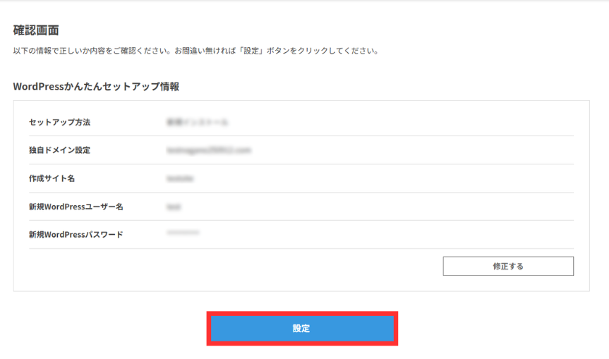 内容を確認して、設定ボタンをクリックすれば完了です。
